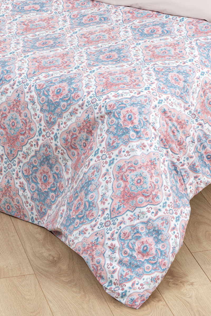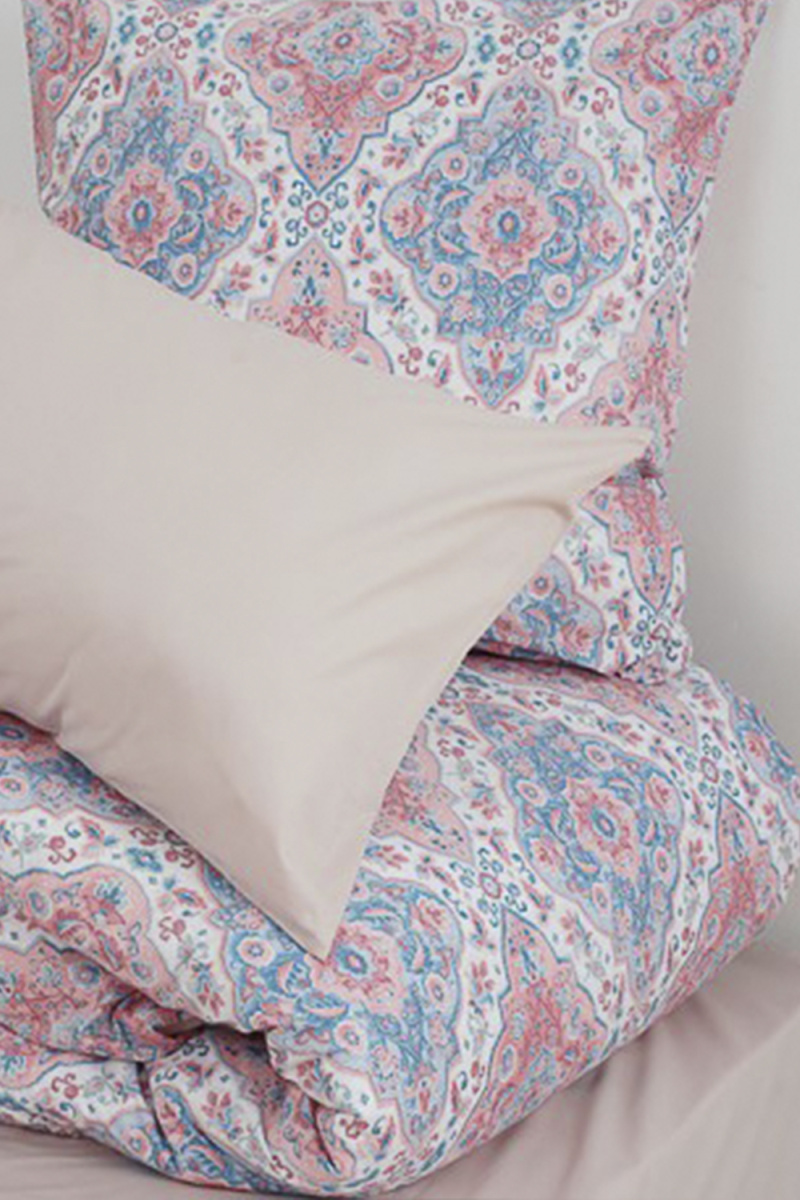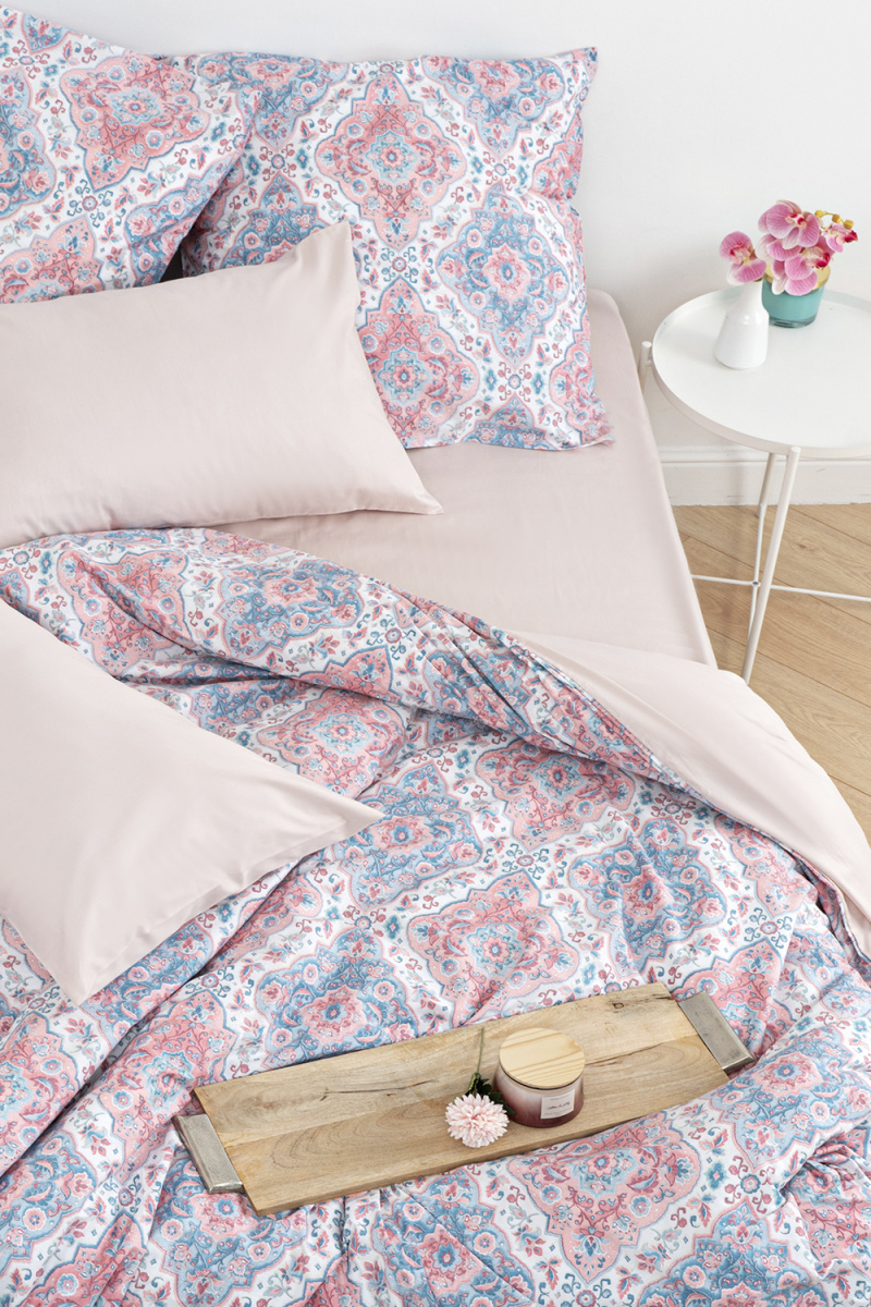 Постельное белье выполнено из сатина высокой плотности (пряжа 40х40) с пигментным окрашиванием. Ткань шелковистая, очень приятная на ощупь. Пододеяльник и наволочки сшиты из основной ткани, простынь и обратная сторона пододеяльника выполнены из ткани-компаньона.
